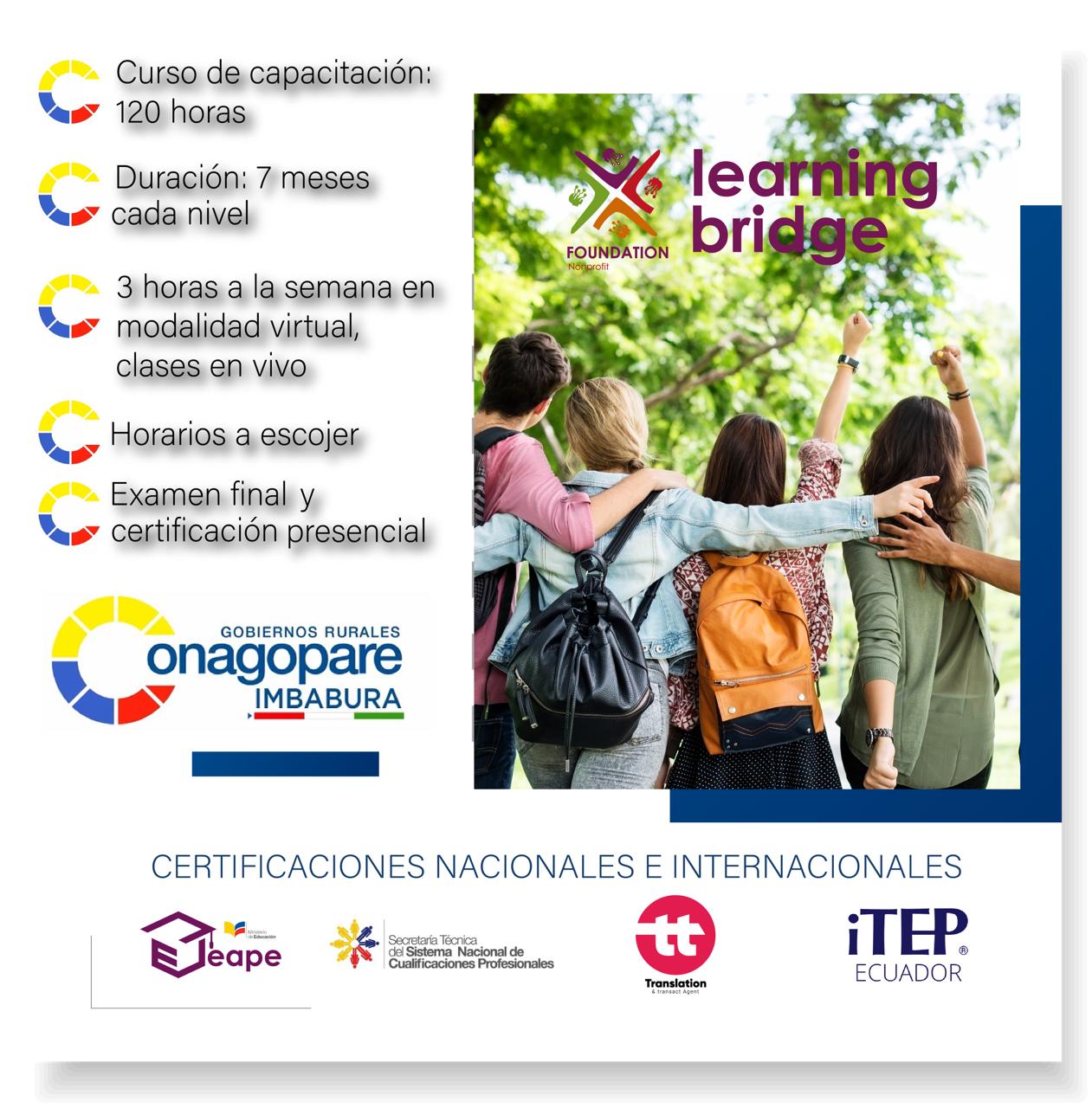 En CONAGOPARE Imbabura trabajamos para generar oportunidades reales de desarrollo para nuestras parroquias rurales. Por ello, gracias al convenio interinstitucional con Learning Bridge, ponemos a disposición de toda la ciudadanía un nuevo proceso de inscripciones para acceder a un programa de formación en inglés con beca del 90%.